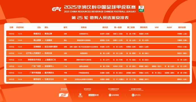 10月4日讯 2025华润饮料中甲联赛第25轮裁判选派结果公布,广东广州豹vs深圳青年人、广西平果vs重庆铜梁龙两场争二关键战均安排有VAR裁判。